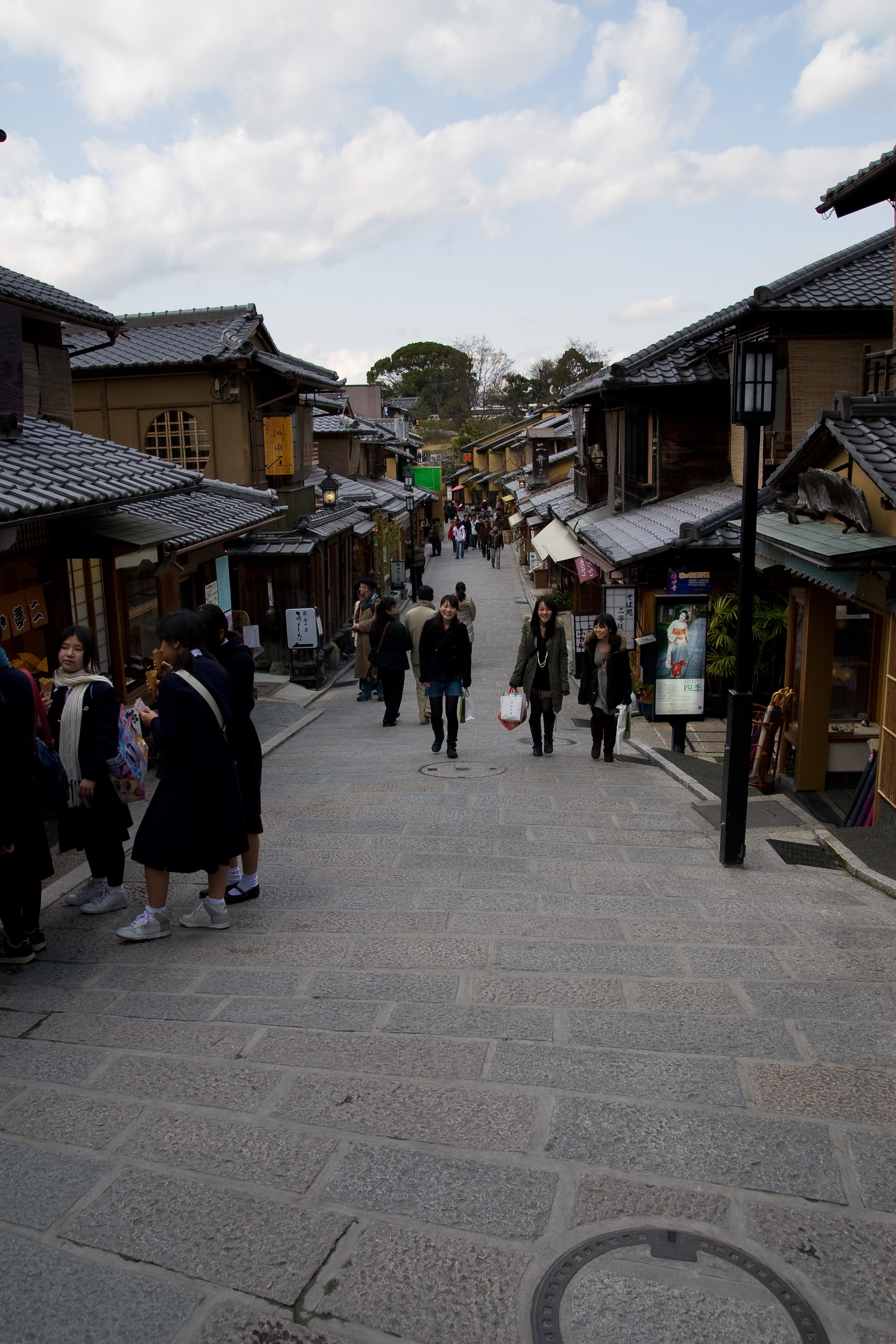 Por la tarde estuvimos en el barrio de Gion, que es el barrio tradicional de Kioto. En esta época es cuando se están acabando las clases y estaban cerca las vacaciones de primavera, así que las calles estaban abarrotadas de jóvenes que salían a pasear. Es un barrio repleto de tiendas y restaurantes.